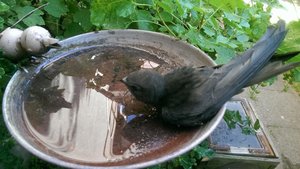 Vermutlich war es ein junger Mauersegler, der sich auf unseren Dachboden verirrt hatte. Er lag völlig entkräftet auf der Bodentreppe und ließ sich widerstandslos greifen. Wir haben ihn nach unten getragen und in die Vogeltränke gesetzt. Das Wasser hat er gefunden und einige Schnäbel voll davon getrunken. Nach 10 Minuten haben wir ihn in einen Karton gesetzt, damit das Gefieder wieder trocknen konnte. Zuerst schien er zu schlafen, aber nach etwa einer Stunde fing er an sein Gefieder zu pflegen und wurde sichtlich munterer. Völlig unerwartet, weil er immer noch erschöpft schien, hat er plötzlich die Flügel ausgebreitet und ist davon geflogen.