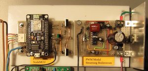 Inzwischen gibt es in meiner Anlage mehrere Mikrocontroller. Dieser ESP8266 steuert aber die wesentlichen Funktionen, indem er die Anlagenspannung überwacht, und sendet den Status der Anlage per WLAN. Eigentlich sollte er auch das PWM Signal für die Stromweiche erzeugen, aber an der Aufgabe bin ich erst mal gescheitert.