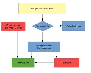 Ein besondere Herausforderung war die Schaltung, die dafür sorgen sollte, dass der Strom, der gerade nicht in der Anlage gebraucht wird, zur Boilerheizung umgelenkt wird, wobei der Anlagenstrom immer Vorrang haben sollte.