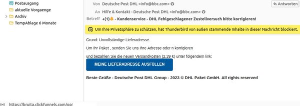 Immer wieder werden E-Mails versendet, die Daten der Mailempfänger oder Empfängerinnen abfischen wollen. Zumindest im E-Mail Programm Thunderbird sind solche E-Mails eigentlich gut zu identifizieren.